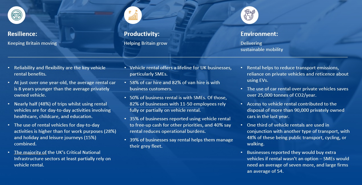 Rental vehicles are the worker bees of the transport system. Unglamorous and largely out of sight, they are essential for the survival of their ecosystem – UK society. With its inherent flexibility and a client base as diverse as UK itself, the vehicle rental sector is a bellwether for business and consumer confidence and shifts in transport behaviour. This report captures the vehicle rental sector's impact and the scale of its contribution to the UK's economy and society.